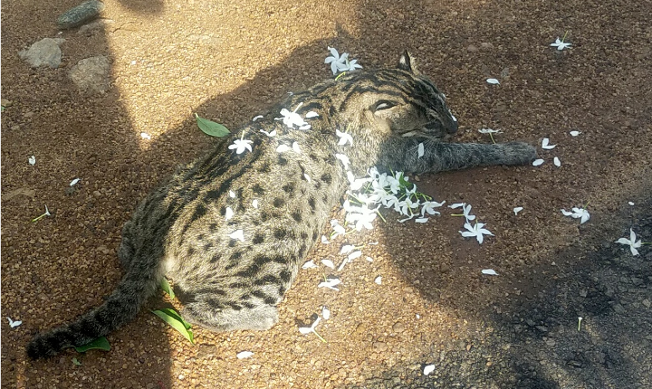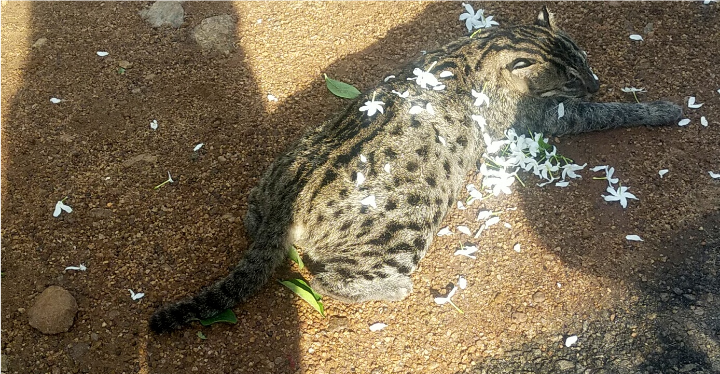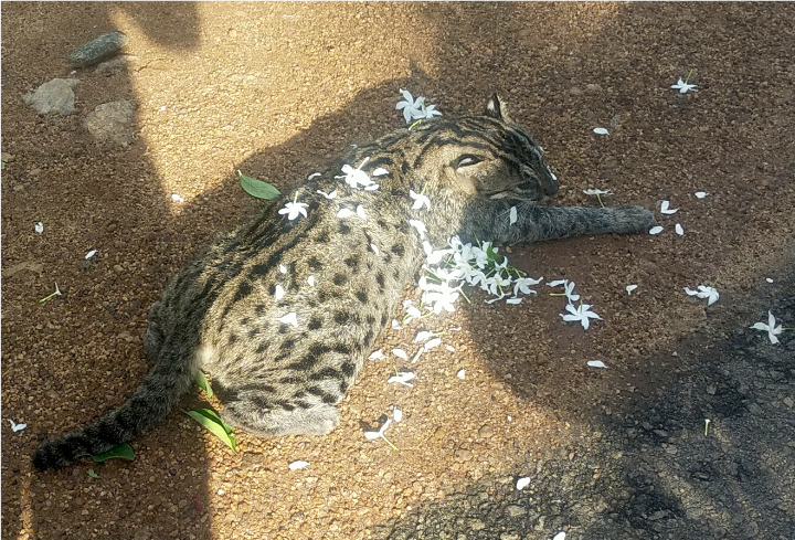 காட்டுப் பூனை என அழைக்கப்படும் இப்புலியை சுற்றி மல்லிகைப் பூக்கள் தூவப்பட்டுள்ளமையும் இங்கு சுட்டிக்காட்டத்தக்கது. அண்மைக்காலமாக அப்பகுதியில் உள்ள கோழிகளை வேட்டையாடி வந்ததாக அப்பகுதி மக்கள் தெரிவித்துள்ளதுடன் இதே போன்று அண்மையில் கோட்டைக்கல்லாற்று பாலம் அருகிலும் புலியின் உடலம் ஒன்றும் மீட்கப்பட்டதாக குறிப்பிட்டனர்.