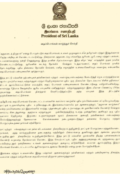 இந்த நாட்டு மக்களின் நற்பண்புகள்,நல்லிணக்கம் மற்றும் சகவாழ்வு என்பவற்றை மேம்படுத்தி சமூக மாற்றத்திற்கான ஆரம்ப முயற்சியாகவும், சுற்றுச்சூழல் மற்றும் நெறிமுறைக்கான புதிய ஒரு திசையின் தொடக்கமாக ‘கிளீன் ஸ்ரீலங்கா’ திட்டம் ஆரம்பிக்கப்பட்டுள்ள சமயத்தில், தைப் பொங்கல் பண்டிகையைக் கொண்டாடுவது மகிழ்ச்சியளிக்கிறது.
