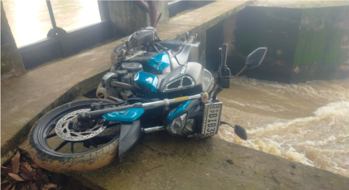 இதன் போது இவ்வனர்த்தம் ஏற்பட்டுள்ளதுடன் தனியாக முன்பாக மோட்டார் சைக்கிளில் சென்ற 32 வயது மதிக்கத்தக்க அப்துல் லத்தீப் இக்ராம் என்பவர் ஆற்றினுள் தவறி விழுந்து நீரில் அடித்து செல்லப்பட்டு காணாமல் சென்றிருந்தார்.இவர் வெளிநாட்டில் தொழில் புரிந்து வந்த நிலையில் சில நாட்களுக்கு முன் விடுமுறை நிமிர்த்தம் நாடு திரும்பி இருந்த நிலையில் இந்த அனர்த்தத்திற்கு முகம் கொடுத்துள்ளமை குறிப்பிடத்தக்கது.