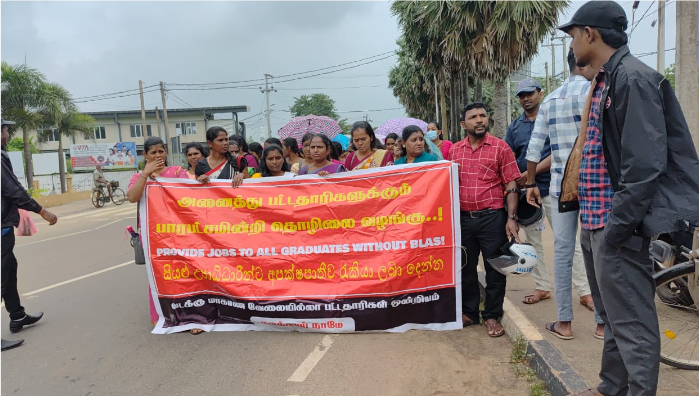 இதன் பொழுது வேலை வேண்டும் வேலை வேண்டும் பட்டதாரிகளுக்கு வேலை வேண்டும் ,படித்தும் பரதேசிகளாக இன்றும் தொடரும் அவலம் ,பல பரீட்சைகளை தொடர்ந்து என்ன பிரியோசனம் என்றவாறு பல கோஷங்களை எழுப்பிய வண்ணம் உலகதழிராய்சி மாநாட்டு படுகொலை நினைவுத்தூபியில் இருந்து யாழ் நகரினூடாக ஆளுநர் அலுவலகத்திற்கு சென்று அங்கு போராட்டத்தில் ஈடுபட்டனர்.