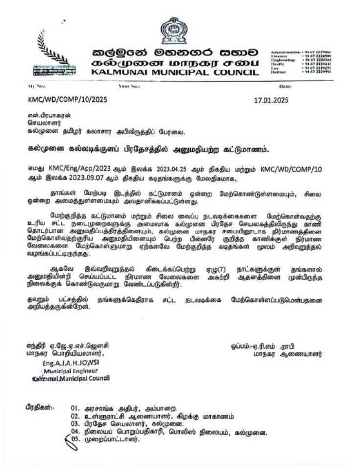 அந்த கடிதத்தில் எமது KMC/Eng/App/2023 ஆம் இலக்க 2023.04.25 ஆம் திகதிய மற்றும் KMC/WD/COMP/10 ஆம் இலக்க 2023.09.07 ஆம் திகதிய கடிதங்களுக்கு மேலதிகமாக, தாங்கள் மேற்படி இடத்தில் கட்டுமானம் ஒன்றை மேற்கொண்டுள்ளமையும், சிலை ஒன்றை அமைத்துள்ளமையும் அவதானிக்கப்பட்டுள்ளது. மேற்குறித்த கட்டுமானம் மற்றும் சிலை வைப்பு நடவடிக்கைகளை மேற்கொள்வதற்கு உரிய சட்ட நடைமுறைகளுக்கு அமைவாக கல்முனை பிரதேச செயலகத்திலிருந்து காணி தொடர்பான அனுமதிப்பத்திரத்தினையும், கல்முனை மாநகர சபையினூடாக நிர்மாணத்தினை மேற்கொள்வதற்குரிய அனுமதியினையும் பெற்ற பின்னரே குறித்த குறித்த காணிக்குள் நிர்மாண வேலைகளை மேற்கொள்ளுமாறு ஏற்கனவே மேற்குறித்த கடிதங்கள் மூலம் அறிவுறுத்தல் வழங்கப்பட்டிருந்தது.