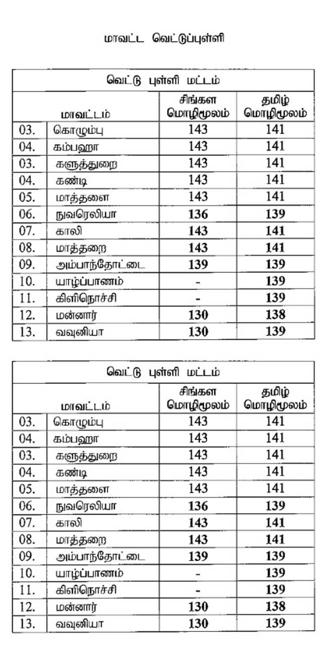 யாழ்ப்பாணம் மற்றும் கிளிநொச்சி மாவட்டத்திற்கான வெட்டுப்புள்ளி 139 ஆக உள்ளது.