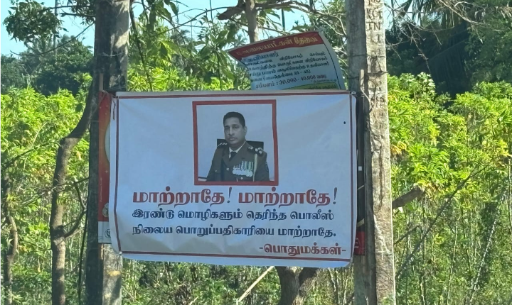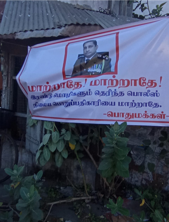 தமிழர் பகுதிகளில் தமிழ் மொழி பேசக்கூடிய பொலிஸ் அதிகாரிகள் கடமையாற்ற வேண்டும் என பல்வேறு தரப்பினரும் கோரி வரும் நிலையில் , தமிழ் மொழி பேசக்கூடிய பொறுப்பதிகாரி திடீர் இடமாற்றம் செய்யப்பட்டுள்ள நிலையில் குறித்த பதாகைகள் கட்டப்பட்டுள்ளன.