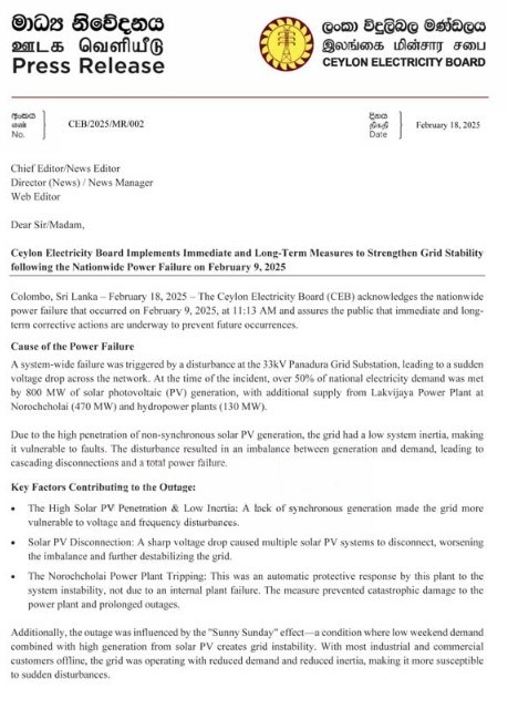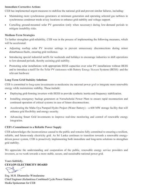 குறித்த அறிக்கையில், மின் தடைக்கான காரணத்தையும், மின் கட்ட நிலைத்தன்மைக்கு எதிர்காலத்தில் எடுக்க வேண்டிய நடவடிக்கைகளையும் இலங்கை மின்சார சபை தெளிவுபடுத்தியுள்ளது.