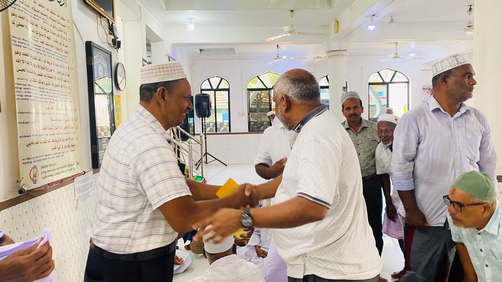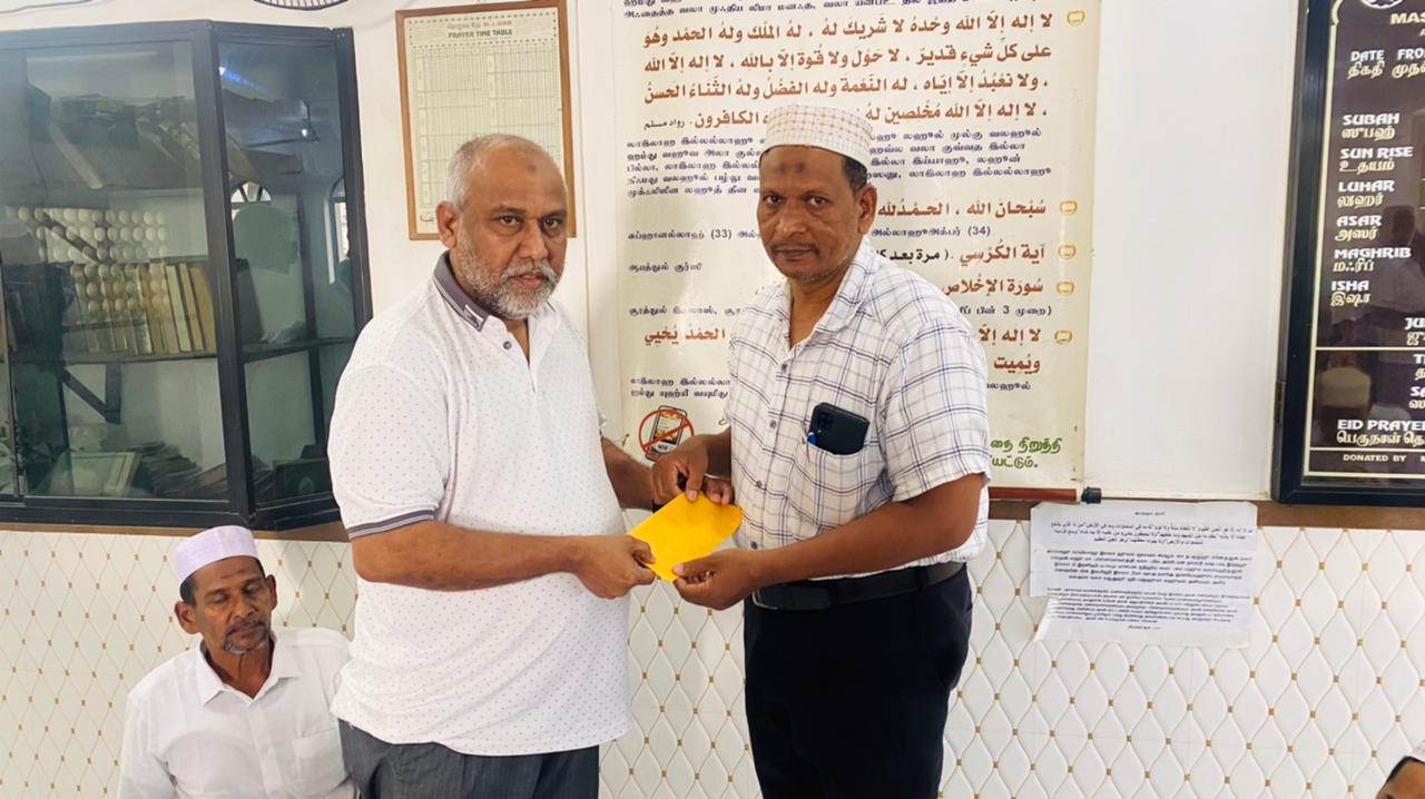 அம்பாறை மாவட்டம் கல்முனை மாநகர சபைக்குட்பட்ட சாய்ந்தமருது தக்வா ஜும்ஆ பள்ளிவாசல் நிர்வாகத்தினரால் விடுக்கப்பட்ட கோரிக்கைக்கமைய 1 இலட்சம் ரூபாய்க்கான காசோலையை இவர் வழங்கி வைத்தார்.