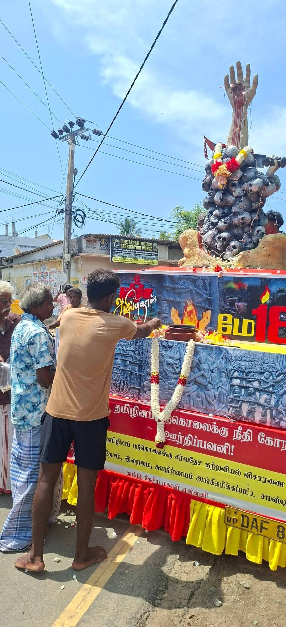 “தமிழினப் படுகொலைக்கு சர்வதேச குற்றவியல் விசாரணை வேண்டும், தேசம், இறைமை, சுயநிர்ணயம் அங்கீகரிக்கப்பட்ட சமஸ்டி வேண்டும்” போன்ற வாசகங்கள் அடங்கிய பதாகைகள் கட்டப்பட்டு இனப்படுகொலை நினைவுத்தூபி வைக்கப்பட்டுள்ள நிலையில், வீதிகளில் பயணித்த பொதுமக்கள் அஞ்சலி செலுத்தினர்.