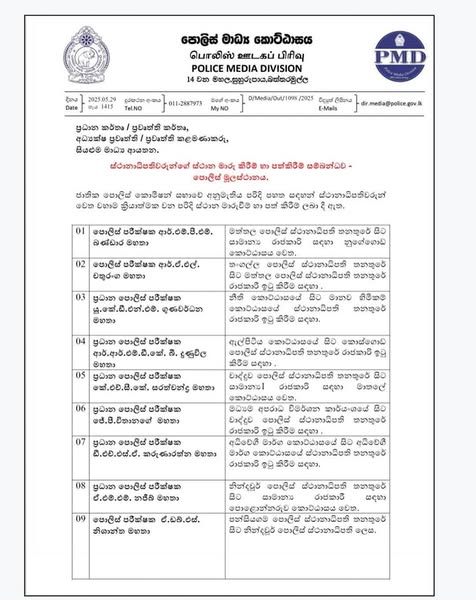 அதன்படி,வத்தளை பொலிஸ் நிலைய பொறுப்பதிகாரி நுகேகொடை பொலிஸ் நிலையத்திற்கும்,தங்காலை பொலிஸ் நிலைய பொறுப்பதிகாரி வத்தளை பொலிஸ் நிலையத்திற்கும்,பொலிஸ் சட்ட பிரிவின் பொறுப்பதிகாரி பொலிஸ் மனித உரிமைகள் பிரிவுக்கும்,எல்பிட்டிய பொலிஸ் பிரவின் பொறுப்பதிகாரி கொஸ்கொடை பொலிஸ் நிலையத்திற்கும், வாதுவை பொலிஸ் நிலைய பொறுப்பதிகாரி மாத்தளை பொலிஸ் நிலையத்திற்கும், மத்திய குற்றப் புலனாய்வு பிரிவின் பொறுப்பதிகாரி வாதுவை பொலிஸ் நிலையத்திற்கும்,அதிவேக வீதி பொலிஸ் பிரிவிலிருந்தவருக்கு அதிவேக வீதி பொலிஸ் பிரிவின் பொறுப்பதிகாரியாகவும்,
