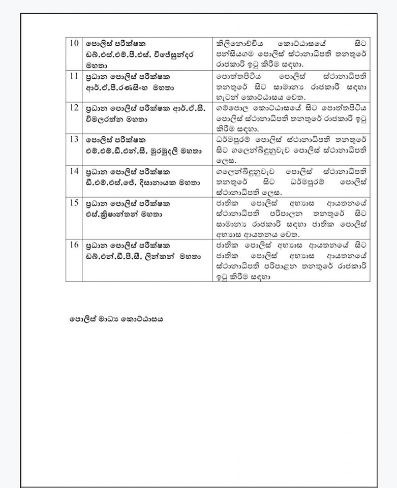 மேலும், கிளிநொச்சி பொலிஸ் பிரிவின் பொறுப்பதிகாரி பன்சியகம பொலிஸ் நிலையத்திற்கும், பொத்தப்பிட்டிய பொலிஸ் நிலைய பொறுப்பதிகாரி ஹட்டன் பொலிஸ் பிரிவுக்கும்,கம்பளை பொலிஸ் பிரிவின் பொறுப்பதிகாரி பொத்தப்பிட்டிய பொலிஸ் நிலையத்திற்கும்,தருமபுரம் பொலிஸ் நிலைய பொறுப்பதிகாரி கலென்பிந்துனுவெவ பொலிஸ் நிலையத்திற்கும்,