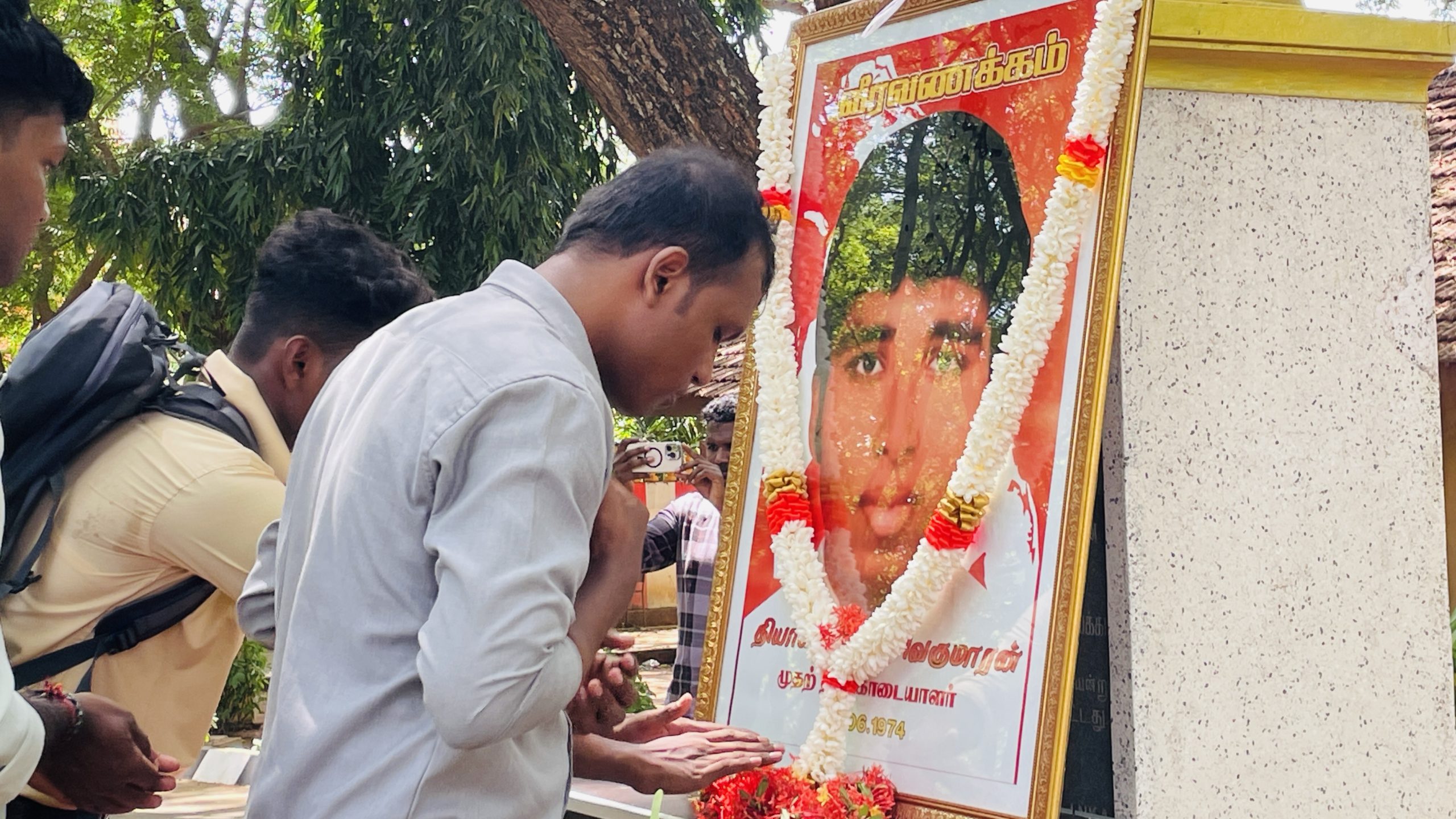 யாழ். பல்கலை கழக வளாகத்தில் இன்றைய தினம் வியாழக்கிழமை மதியம் நடைபெற்ற நிகழ்வில் , பொன் சிவகுமாரனின் திருவுருவ படத்திற்கு மாணவர்கள் மலர் மாலை அணிவித்து மலரஞ்சலி செலுத்தினர்.