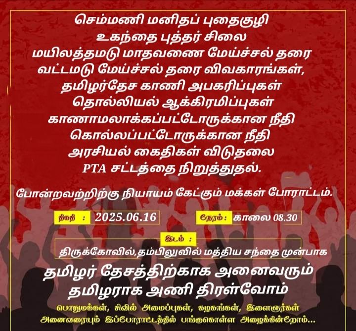 இந்தப் போராட்டத்தின் போது செம்மணி மனிதப் புதைகுழி உகந்த புத்த சிலை நிர்மாணம் தமிழர் காஷி அபகரிப்புகள் தொல்லியல் ஆக்கிரமிப்புகள் காணாமல் ஆக்கப்பட்டோருக்கான நீதி கொல்லப்பட்டோருக்கான நீதி அரசியல் கைதிகள் விடுதலை பயங்கரவாத தடை சட்டத்தை நிறுத்துதல் போன்றவற்றிற்கு நியாயம் கேட்கும் மக்கள் போராட்டமாக இப்ப போராட்டம் அமைந்திருந்தது.