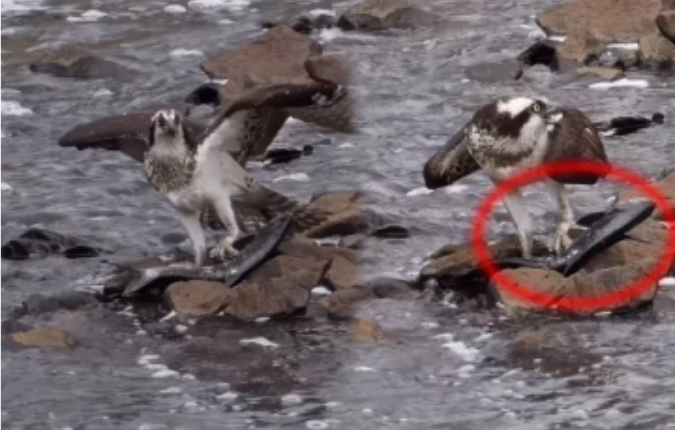 இங்கு காணொளி ஒன்றில், கழுகு மிகப்பெரிய மீனை வேட்டையாடுகின்றது. ஆனால் குறித்த மீன் அளவில் பெரிதாக இருப்பதால், கழுகை நீரிலிருந்து எழும்ப விடாமல் தண்ணீருக்குள் இழுத்துக் கொண்டே இருக்கின்றது.