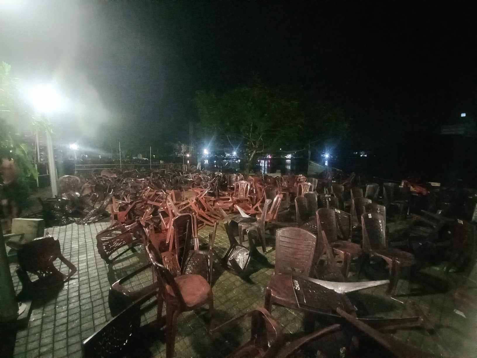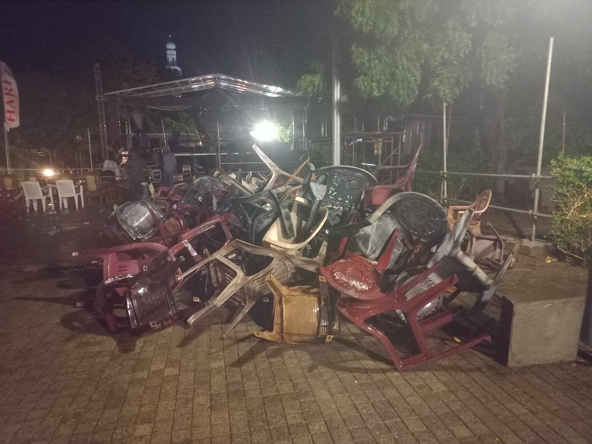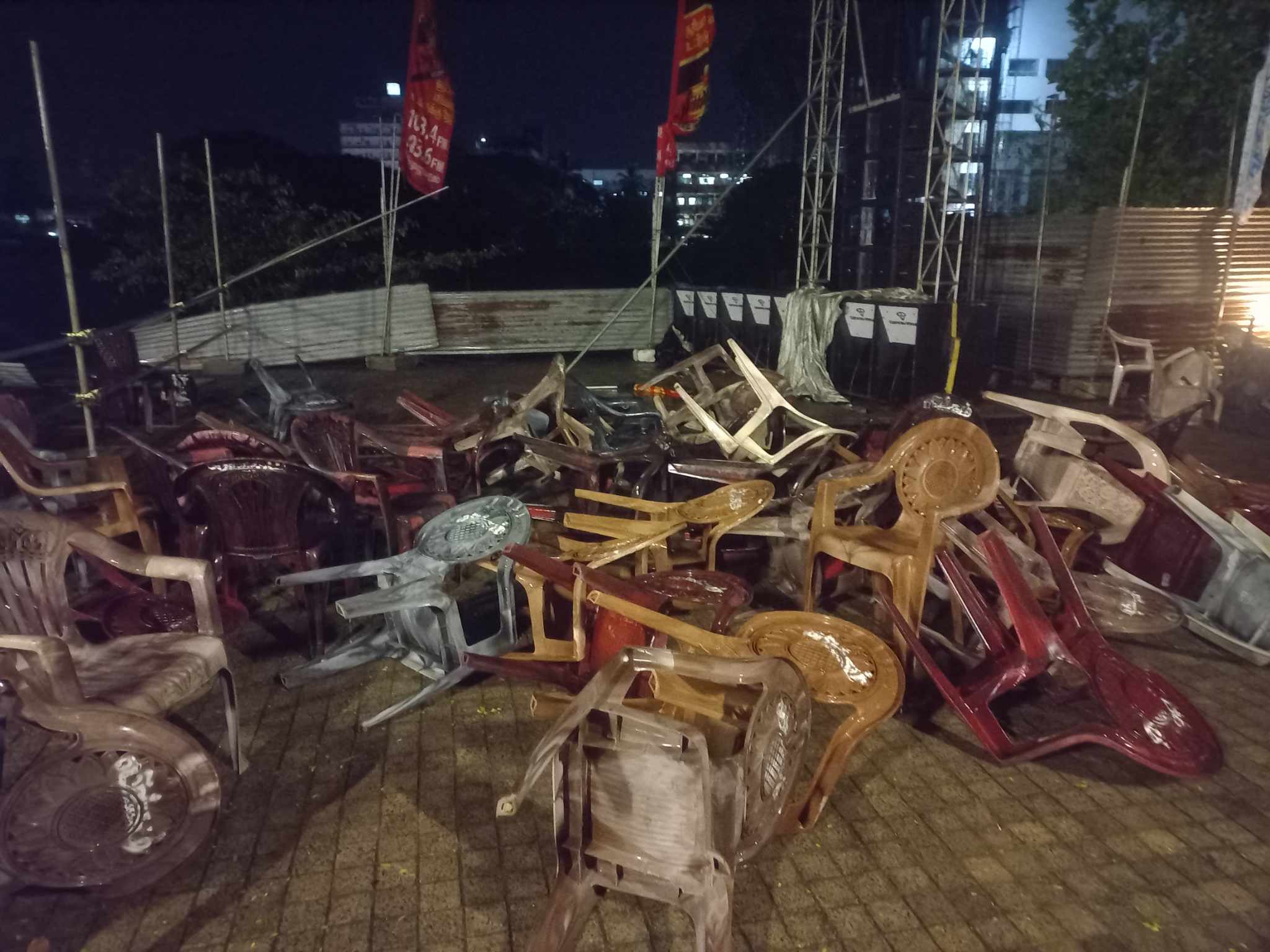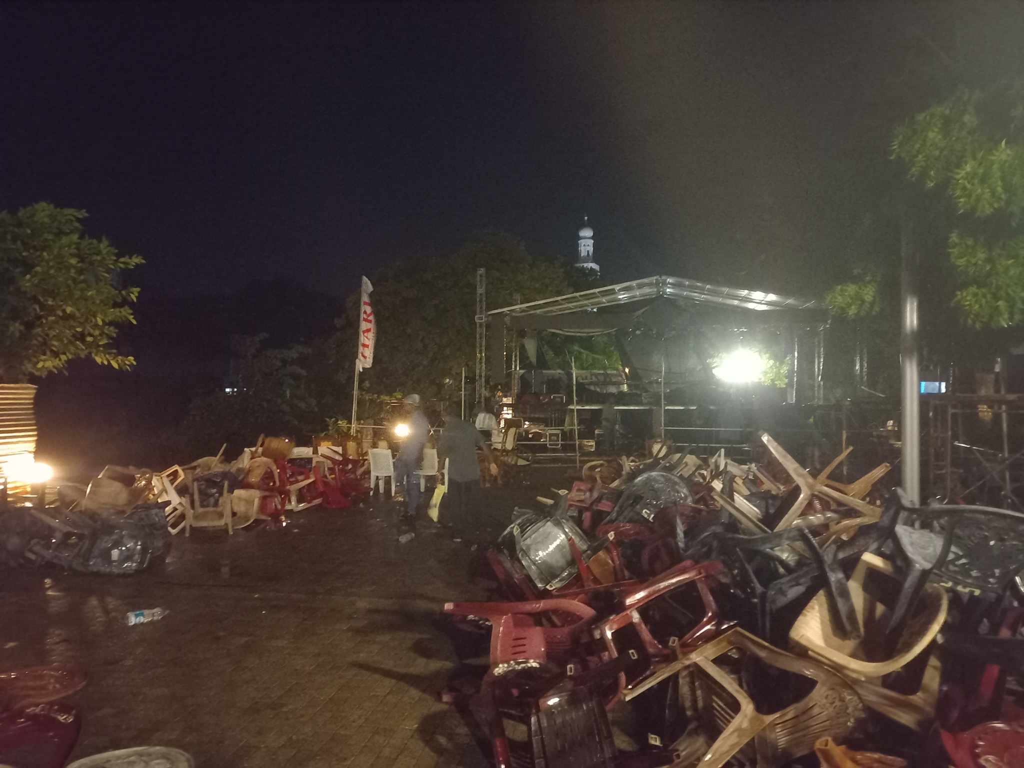 இந்நிலையில் இசை நிகழ்வின் ஆரம்ப நிகழ்வாக , மங்கள விளக்கேற்றும் வேளை திடீரென கடும் காற்றுடன் கூடிய மழை பெய்தமையால் , நிகழ்வுக்காக போடப்பட்டிருந்த கதிரைகள் , அருகில் இருந்த பந்தல்களின் தகரங்கள் என்பன காற்றினால் தூக்கி வீசப்பட்டமையால் , பார்வையாளர்கள் அங்கிருந்து வெளியேறி சென்றனர்.