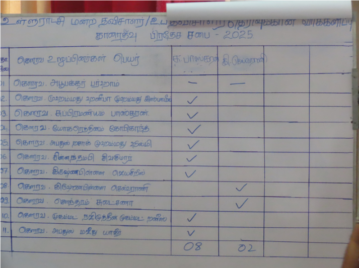 இதன்போது நடைபெற்ற பகிரங்க வாக்கெடுப்பின் போது தேசிய மக்கள் சக்தி உறுப்பினர் ஒரவர் நடுநிலை வகித்ததுடன் தமிழ் அரசுக் கட்சி சார்பில் முன்மொழியப்பட்ட உறுப்பினர் சுப்ரமணியம் பாஸ்கரன் என்பருக்கு 08 வாக்குகளும் ஏனைய தரப்பினரால் புதிய தவிசாளராக தேசிய மக்கள் சக்தி சார்பில் முன்மொழியப்பட்ட கிறிஸ்ணபிள்ளை செல்வராணி என்பருக்கு 02 வாக்குகளும் கிடைக்கப்பெற்றமை சுட்டிக்காட்டத்தக்கது.