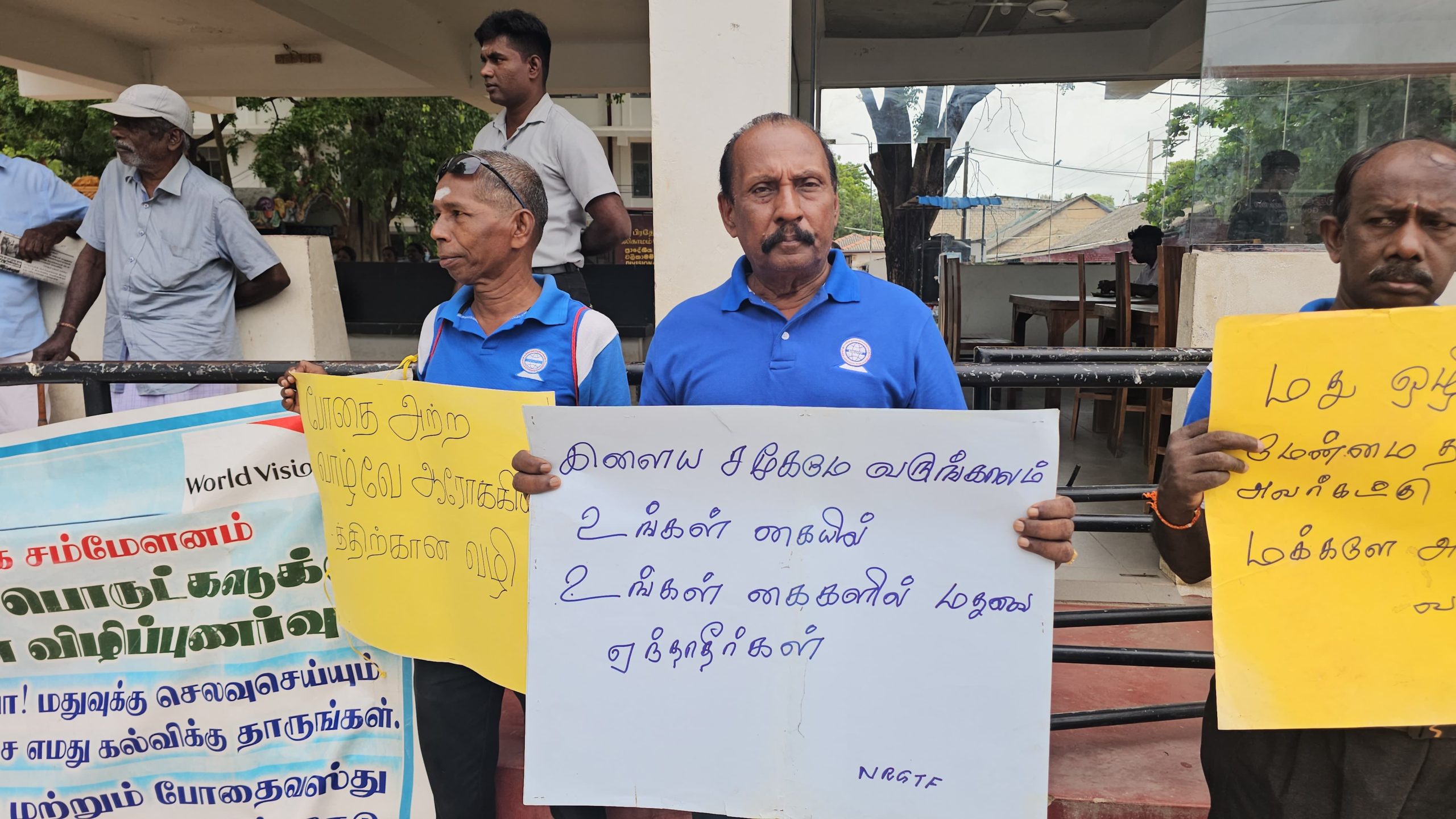 போராட்டத்தில் ஈடுபட்டவர்கள், “போதை அற்ற வாழ்வே ஆரோக்கியத்திற்கான வழி : எம் சமூகத்தை அழிக்கும் மது எமக்கு தேவைதானா? : அரசே புதிய மதுபான சாலைகளுக்கு அனுமதி வழங்காதே : மது ஒழிப்பில் ஈடுபடும் ஜனாதிபதிக்கு கை கொடுப்போம் : போதையெனும் சாக்கடையில் விழாதீர்கள் என எழுதிய பதாகைகள் மற்றும் கோஷங்களுடன் ஆர்ப்பாட்டத்தில் ஈடுபட்டனர்.