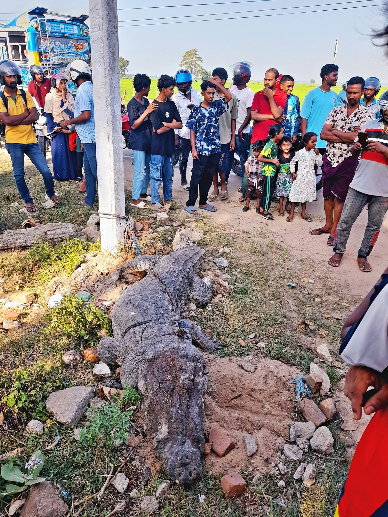 பாலமுனை வைத்தியசாலைக்கு அருகில் ஊருக்குள் புகுந்த பெரிய முதலை ஒன்றை பிடித்த மக்கள் மரத்தில் கட்டி வைத்துள்ளனர்.