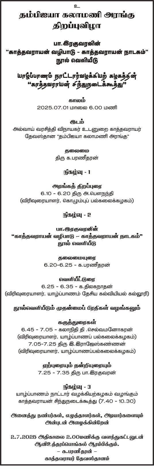 தம்பிஐயா கலாமணி அரங்க திறப்பு விழாவும், பா. இரகுவரனின் “காத்தவராயன் வழிபாடு – காத்தவராயன் நாடகம்” நூல் வெளியீடும், யாழ்ப்பாணம் நாட்டார் வழக்கியற் கழகத்தின் காத்தவராயன் சிந்துநடைக் கூத்தும் 01.07.2025 செவ்வாய்க்கிழமை மாலை 6.30 மணிக்கு யாழ். வடமராட்சி அல்வாய் வரசித்தி விநாயகர் உடனுறை காத்தவராயர் தேவஸ்தான தம்பிஐயா கலாமணி அரங்கில் இடம்பெற்றது.