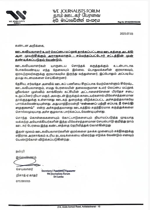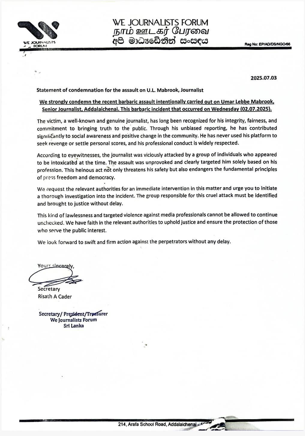 இதற்கமைய ஸ்ரீலங்கா முஸ்லிம் மீடியா போரத்தின் உறுப்பினரும். சிரேஷ்ட ஊடகவியலாளருமான யூ.எல். மப்றூக் மீது அட்டாளைச்சேனை பிரதேச அரசியல்வாதி ஒருவரினால் கடந்த ஜூலை 2ஆம் திகதி புதன்கிழமை இரவு மேற்கொள்ளப்பட்ட தாக்குதலை இவ்வமைப்புக்கள் கண்டிக்கிறது.