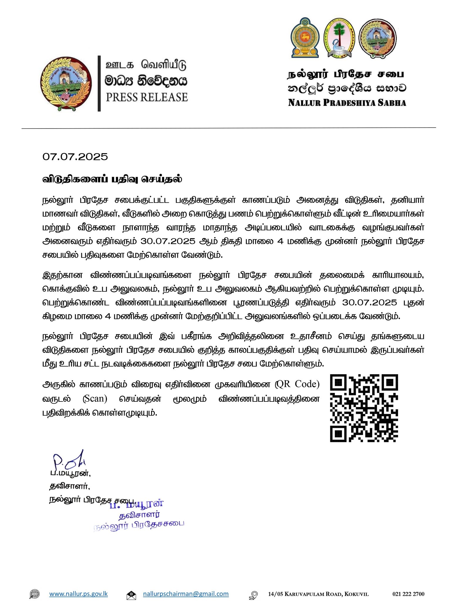 இதற்கான விண்ணப்பப்படிவங்களை நல்லூர் பிரதேச சபையின் தலைமைக் காரியாலயம், கொக்குவில் உப அலுவலகம், நல்லூர் உப அலுவலகம் ஆகியவற்றில் பெற்றுக்கொள்ள முடியும்.