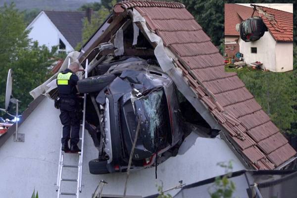 ஜேர்மனியில் பறந்து வீட்டின் கூரையில் சொருகிய கார்! என்ன நடந்தது?