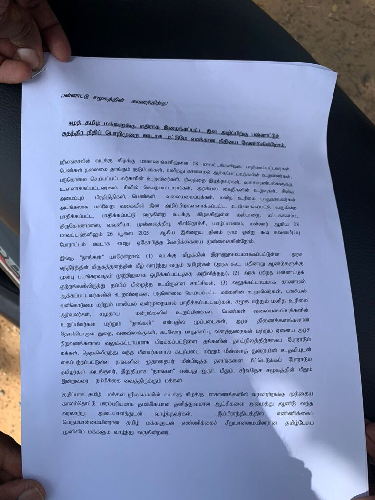 இன்றைய தினம் (26) வடக்கு, கிழக்கு தமிழர் தாயகம் எங்கும் கவனயீர்ப்புப் போராட்டம் முன்னெடுக்கப்பட்டு வருகின்றது.