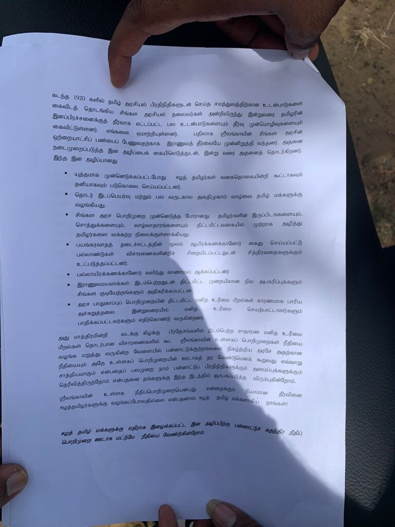 தமிழர்களுக்கு இழைக்கப்பட்ட இன அழிப்பிற்கான தீர்வானது சர்வதேச நீதிப் பெறிமுறைகள் ஊடாகவே வழங்கப்பட முடியும் என்பதை வலியுறுத்தி இப் போராட்டம் முன்னெடுக்கபப்ட்டுள்ளது.