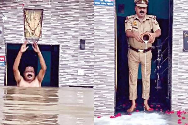 வீட்டிற்குள் புகுந்த கங்கை நீரில் பால் ஊற்றி புனித நீராடிய பொலிஸ் அதிகாரியின் புகைப்படம் இணையத்தில் வைரலாகி வருகிறது.