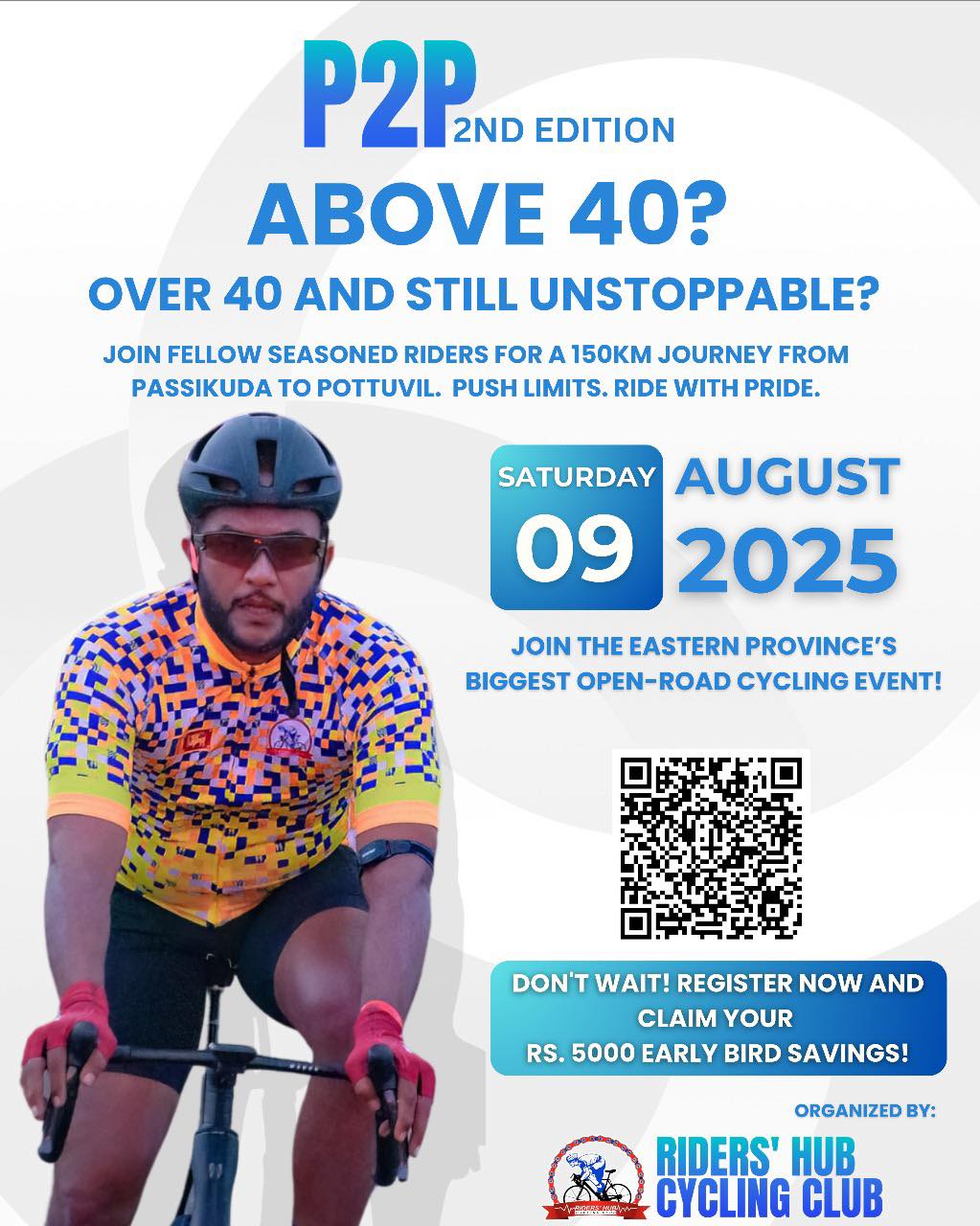 ரைடர்ஸ் ஹப் சைக்கிளிங் கழகம் ஏற்பாடு செய்துள்ள அனைவருக்கும் பாதுகாப்பான சாலைகள் எனும் தொனிப்பெருளில் நடைபெறவுள்ள குறி்த்த சைக்கிள் சவால் போட்டியானது பாசிக்குடா முதல் பொத்துவில் வரையிலான P2P சைக்கிள் ஓட்டப் போட்டி 2025 ஆம் ஆண்டு ஆகஸ்ட் 9 ஆம் திகதி இடம்பெற உள்ளது. பாசிக்குடாவில் இருந்து காலை 6.00 மணிக்கு ஆரம்பமாகி பொத்துவில் அறுகம்பை வரை செல்லவுள்ளது.