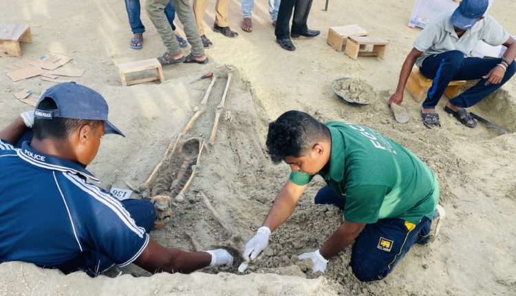 எலும்புக்கூட்டு தொகுதியொன்று நேற்றைய தினம் செவ்வாய்க்கிழமை செருப்புடன் அடையாளம் காணப்பட்ட நிலையில் குறித்த எலும்புக்கூடு அகழ்ந்து எடுக்கப்பட்டுள்ளதுடன், இடுப்பில் தாயம் ஒன்றுடன் எலும்புக்கூடு தொகுதியொன்று அகழ்ந்து எடுக்கப்பட்டுள்ளது.