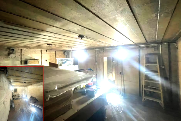 வீட்டை புதுப்பிக்க, ஷான் தனது நண்பருடன் இணைந்து இயந்திரத்தைக் கொண்டு வீட்டின் முன்பகுதியில் தோண்டியுள்ளார். அப்போது நிலம் திடீரென இடிந்து விழுந்து இந்த பதுங்குகிழியின் கதவுப்பகுதி தோன்றியது.