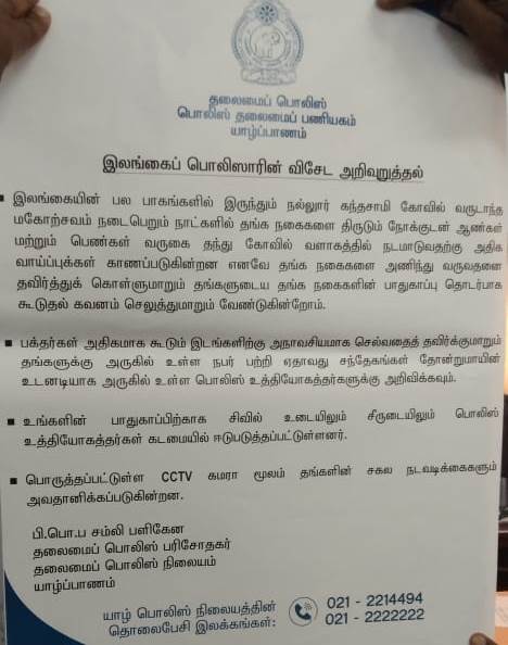 ஆலய சூழலில் திருடர்களின் நடமாட்டம் காணப்படுவதால், ஆலயத்திற்கு தங்க நகைகளை அணிந்து வருவதை தவிர்க்குமாறும் , அணிந்துள்ள தங்க நகைகளில் கவனம் செலுத்துமாறும் பொலிஸார் கோரியுள்ளனர்.