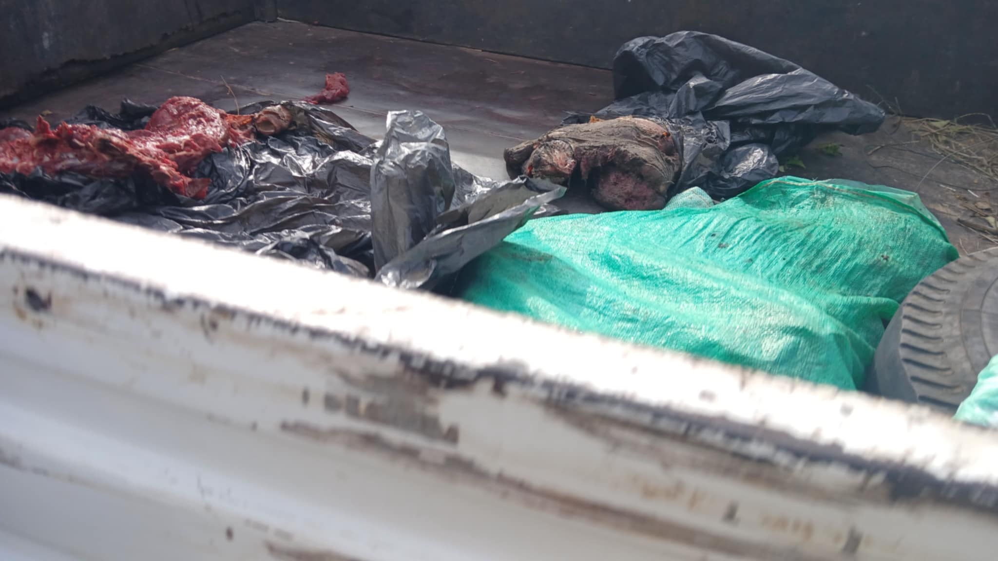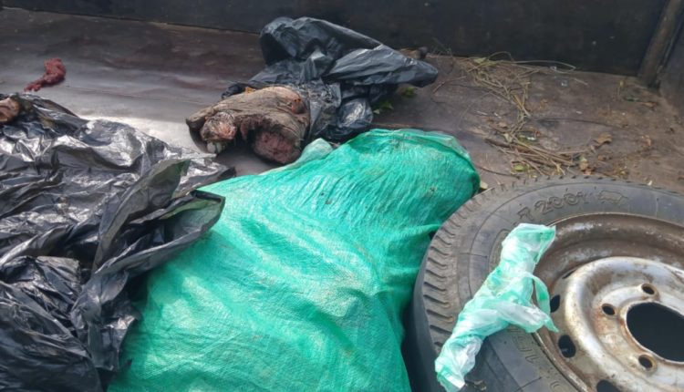 அவ்வேளை வாகனத்தின் பின்னால் இருந்த நால்வர் வாகனத்தை விட்டு குதித்து தப்பியோடியுள்ளனர். அதனை அடுத்து வாகனத்தையும் , வாகன சாரதியையும் பொதுமக்கள் மடக்கி பிடித்து , வாகனத்தை சோதனையிட்ட வேளை, ஒரு தொகை இறைச்சியை வாகனத்தில் இருந்து மீட்டுள்ளனர்.
