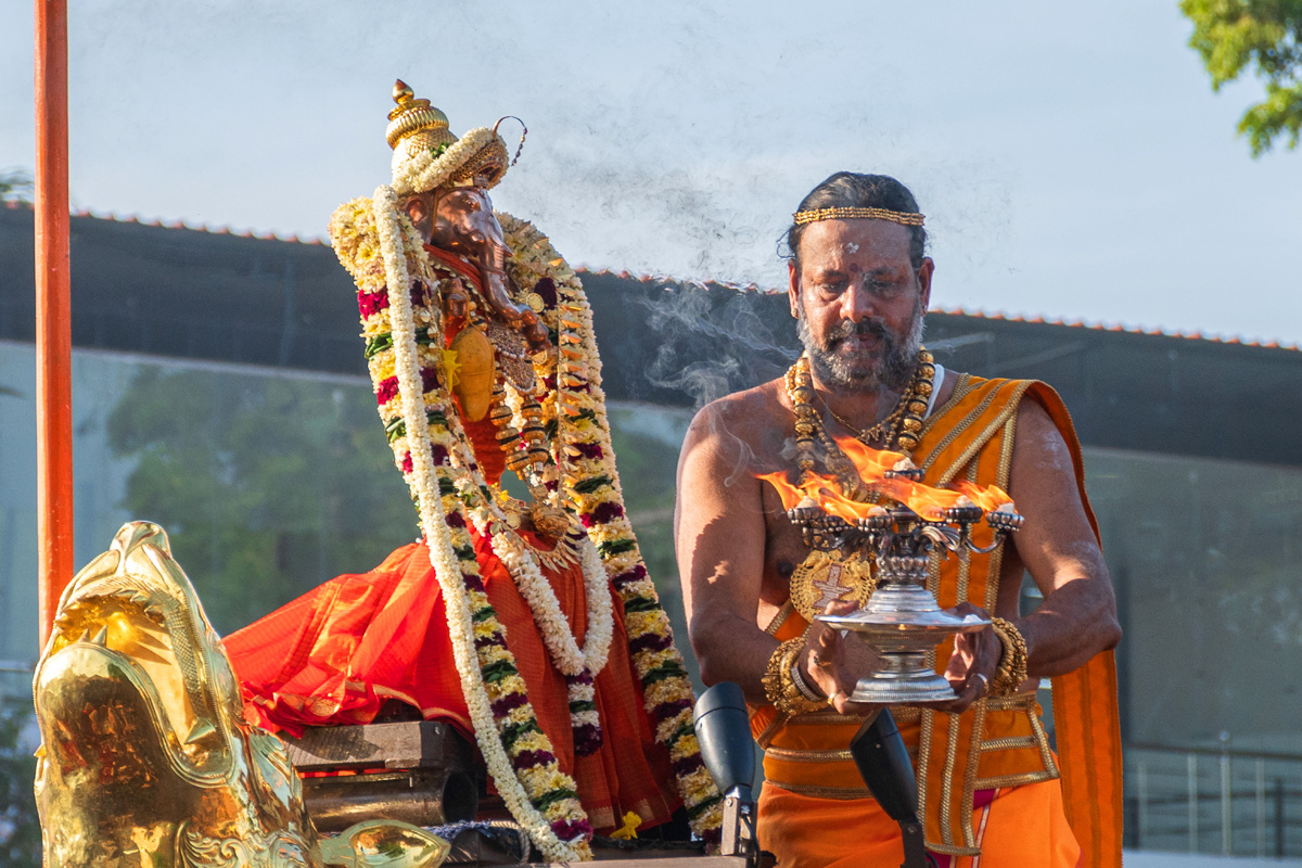 நாரதர் சிவபெருமானுக்கும் , உமாதேவியாருக்கும் ஒரு மாம்பழத்தை கொடுத்தார். அதனை யாருக்கு கொடுப்பது என தீர்மானிக்க , முதலில் உலகை சுற்றி வருபவருக்கே இந்த மாம்பழத்தை தருவோம் என சிவபெருமானும் உமாதேவியாரும் , பிள்ளையாருக்கும் , முருகனுக்கும் கூறினார்கள்.