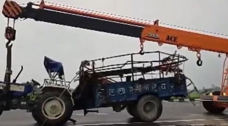 உத்தரப்பிரப் தேசத்தின் காஸ்கஞ்சில் இருந்து ராஜஸ்தானில் உள்ள கோயிலுக்கு பக்தர்களை ஏற்றிக்கொண்டு டிராக்டர் திங்கள்கிழமை அதிகாலை சென்றுகொண்டிருந்தது. அர்னியா நெடுஞ்சாலை அருகே புலந்த்ஷாஹர்-அலிகார் எல்லையில் அதிகாலை 2.10 மணியளவில் டிராக்டர் பின்னால் இருந்து லாரி திடீரென மோதியது.