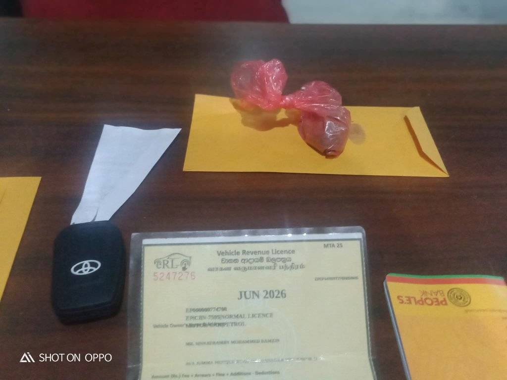 இந்த சோதனையின் போதுஇ சந்தேக நபர் ஐஸ் போதைப்பொருளை கொண்டு செல்ல பயன்படுத்தப்பட்ட நவீன ரக வகை கார் 03 தொலைபேசிகள் 04 வங்கி அட்டைகள் மற்றும் 01 வங்கி புத்தகம் ஆகியவற்றை பொலிஸார் கைப்பற்றியுள்ளனர்.
