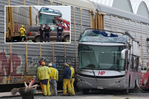 மெக்சிகோவில் பேருந்து மீது சரக்கு ரயில் ஒன்று மோதியதில் பேருந்து இரண்டாக பிளந்தது.