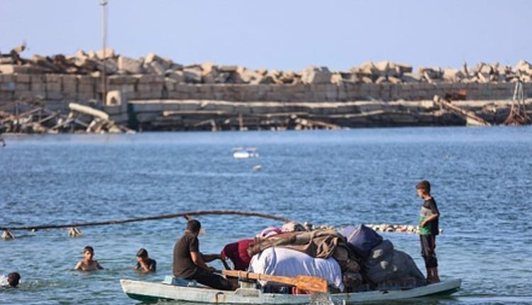 காஸாவின் குறுகிய கடற்கரையோரப் பாதை, வீட்டு உபயோகப் பொருள்கள், போா்வைகள், மெத்தைகள், எரிவாயு உருளைகளுடன் குடும்பத்தினா் சென்ற வாகனங்களாா் நிரம்பியிருந்தது