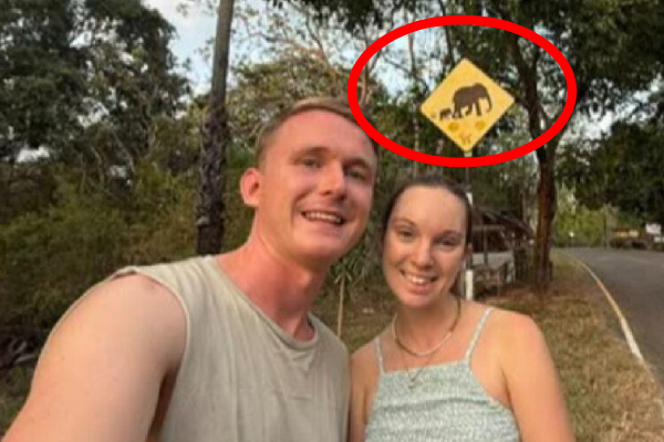 இந்தப் புகைப்படத்தில் அவர்களுக்கு பின்னர் காணப்படும் வீதி சமிக்ஞையில் முன்னால் யானைகள் வரும் பாதை என விளக்கமளிக்கும் குறியீடு உள்ளது.
