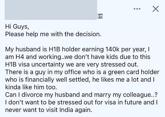 எச்1பி விசா கணவரை விவாகரத்து செய்துவிட்டு கிரீன்கார்ட் சகாவை மணக்கலாமா? வைரலாகும் பெண்ணின் பதிவு!