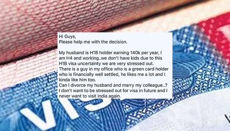 எச்1பி விசா வைத்திருக்கும் கணவரை விவாகரத்து செய்துவிட்டு கிரீன்கார்ட் சகாவை மணக்கலாமா? என்ற இந்திய பெண்ணின் பதிவு இணையத்தில் வைரலாகி வருகின்றது.