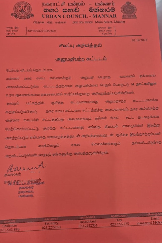 மன்னார் சின்னக்கடை பகுதியில் எவ்வித அனுமதியுமின்றி இயங்கிவந்த தனியார் விடுதியொன்றுக்கு இன்றைய தினம் (9) மன்னார் நகர சபையினால் சிவப்பு அறிவித்தல் விடுக்கப்பட்டுள்ளது.