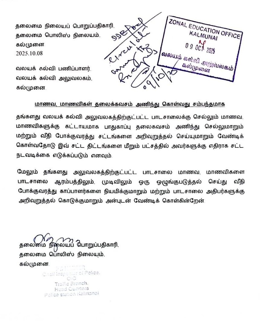 கல்முனை தலைமையக பொலிஸ் பிரிவிற்குட்பட்ட கல்முனை வலயக் கல்வி அலுவலகத்திற்குட்பட்ட பாடசாலைக்கு செல்லும் மாணவ மாணவிகள் தங்களது பாதுகாப்பு கருதி கட்டாயமாக பாதுகாப்பு தலைகவசம் அணிந்து செல்லுமாறு கல்முனை தலைமையக பொலிஸ் நிலைய பொறுப்பதிகாரி லசந்த களுவாராய்ச்சி அறிவித்துள்ளார்.