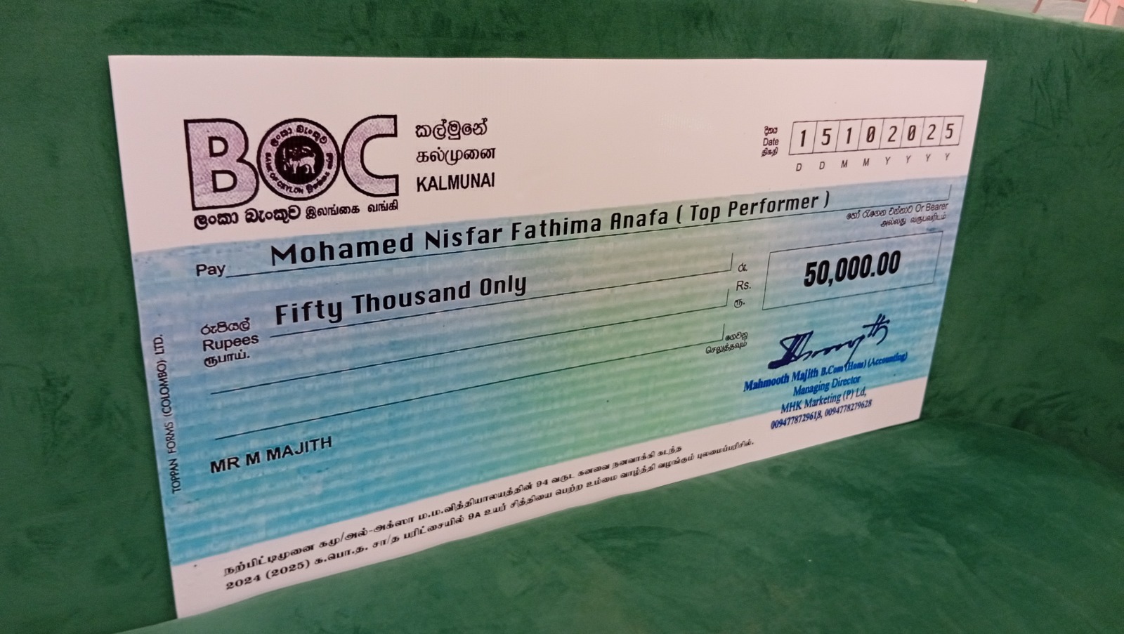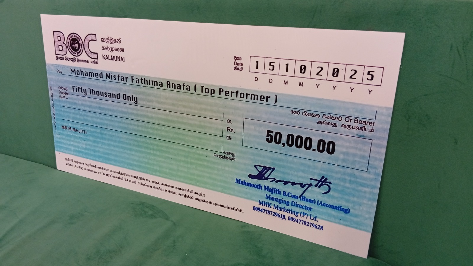 9 ஏ சித்தி பெற்று 94 வருடங்களின் பின்னர் சாதனை நிலை நாட்டிய முகம்மட் நிஸ்பர் பாத்திமா அனபா என்ற மாணவிக்கு பிரபல சமூக சேவகரும் இளம் தொழிலதிபருமான மஹ்மூத் மாஜித் 50 ஆயிரம் ரூபா பெறுமதியான காசோலையை வழங்கி கெளரவித்தார்.