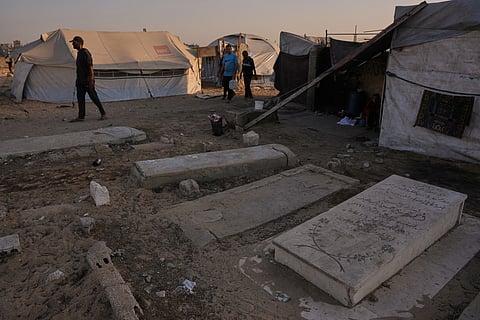 கான் யூனிஸ்: காஸாவில் உயிரிழந்த பாலஸ்தீனர்களின் உடல்கள் புதைக்கப்படும் இடுகாடுகளில், போரால் இடம்பெயர்ந்துள்ள பாலஸ்தீன குடும்பங்கள் தஞ்சமடைந்திருப்பது காஸாவின் அவல நிலையைக் குறிக்கிறது.