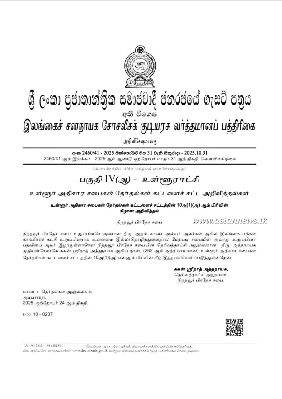 இது குறித்த வர்த்தமானி அறிவித்தலுக்கான பிரகடனத்தில் நிந்தவூர் பிரதேச சபைக்கான தெரிவித்தாட்சி அலுவலர் கடந்த 24ஆம் தேதி ஒப்பமிட்டு வெளிப்படுத்தியுள்ளமை குறிப்பிடத்தக்கதாகும்.