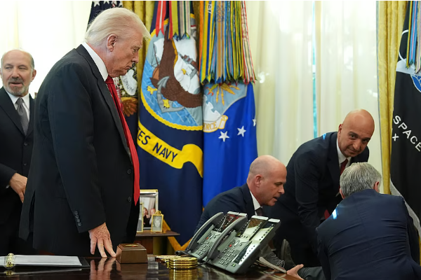 அமெரிக்காவின் ஓவல் அலுவலகத்தில் ஜனாதிபதி டொனால்ட் ட்ரம்ப்பின் அருகே இருந்த நிர்வாகி ஒருவர் திடீரென மயக்கமடைந்ததால் சிறிது சலசலப்பை ஏற்படுத்தியது.