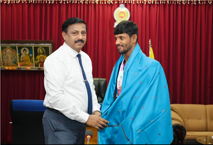 23வது ஆசிய விளையாட்டுப் போட்டியில் இலங்கை சார்பில் 01 தங்கம் மற்றும் 02 வெள்ளிப்பதக்கத்தினை வென்று சாதனை படைத்த மாவட்ட விளையாட்டு வீரா் செல்வராசா ரமணன் அவர்களை இன்றைய தினம் (13.11.2025) அரசாங்க அதிபர் அலுவலகத்தில் நடைபெற்ற கெளரவிப்பு நிகழ்வில் அரசாங்க அதிபர் மருதலிங்கம் பிரதீபன் அவர்கள் பொன்னடை போர்த்தி மலர்மாலையிட்டு கௌரவித்தார்.