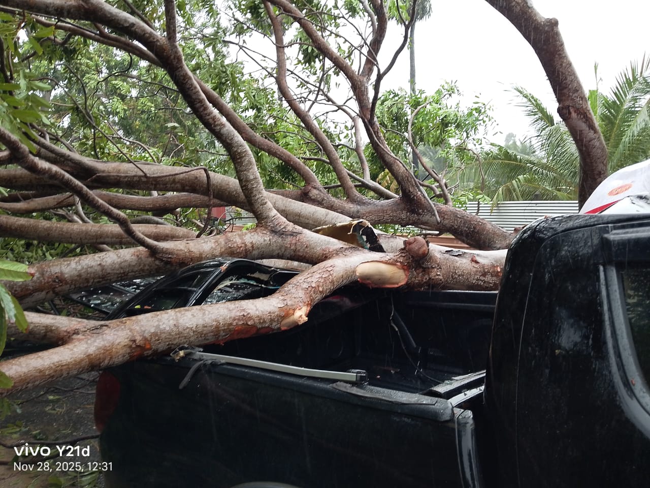 வாகனத்தின் மீது விழுந்த மரத்தினை வெட்டி அகற்றும் நடவடிக்கையில் பிரதேச சபை ஊழியர்கள் ஈடுபட்டுள்ளனர்.