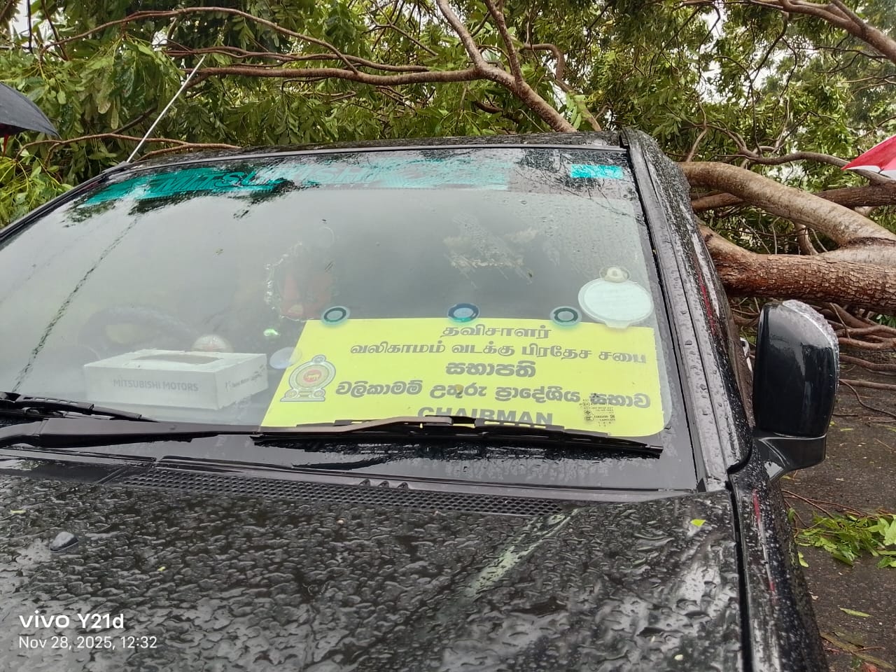 யாழ்ப்பாணம் வலிக்காமம் வடக்கு பிரதேச சபையின் தவிசாளரின் வாகனத்தின் மீது வீதியில் நின்ற மரம் ஒன்று சரிந்து விழுந்ததில் வாகனம் சேதமடைந்துள்ளது.