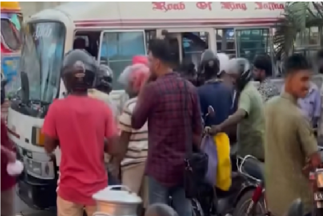 இதனையடுத்து கையில் வைத்திருந்த தலைக்கவசத்தால் நடத்துனரைத் தாக்கிய இளைஞர், சிற்றூர்தியின் படியில் இருந்து நடத்துனரை கீழே தள்ளி விழுத்தியுள்ளார்.