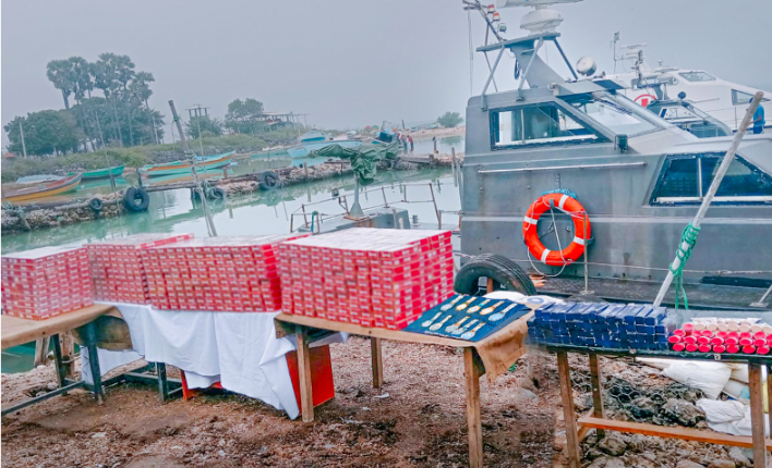 நெடுந்தீவு தெற்கு கடற்பகுதியில் இருந்து பெருந்தொகையான வெளிநாட்டு சிகரெட்டுகள், அழகுசாதனப் பொருட்கள் மற்றும் கைக்கடிகாரங்கள் ஆகியவற்றை கடற்படையினர் கைப்பற்றியுள்ளனர்.